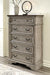 Details | B751B5: Includes California king headboard, footboard and rails, Made with acacia wood, birch and acacia veneers, engineered wood and cast resin components, Antiqued gray finish, Ornately shaped headboard with inset upholstered cushion, Foundation/box spring required, sold separately, Mattress not included, sold separately, Assembly required, B751B1: Includes dresser and mirror, Made with acacia wood, birch and acacia veneers, engineered wood and cast resin components, Two-tone finish; antiqued gray body with a rich, deep walnut brown finish on top, Dark bronze-tone bails and knobs, 7 smooth-gliding drawers with dovetail construction, Framed drawer fronts , Overlay decorative corbels, Mirror attaches to back of dresser, Assembly required, B751-46: Made with acacia wood, birch and acacia veneers, engineered wood and cast resin components, Two-tone finish; antiqued gray body with a rich, deep walnut brown finish on top, Dark bronze-tone bails and knobs, 5 smooth-gliding drawers with dovetail construction, Framed drawer fronts, Overlay decorative corbels, B751-93: Made with acacia wood, birch and acacia veneers, engineered wood and cast resin components, Two-tone finish; antiqued gray body with a rich, deep walnut brown finish on top, Dark bronze-tone bails and knobs, 3 smooth-gliding drawers with dovetail construction, Framed drawer fronts, Overlay decorative corbels, 110V power supply with dual USB charging port, Power cord included; UL listed, | |
