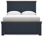 Details B414B3: Includes panel headboard, footboard, rails and slats, Made with hardwood solids, mindi wood veneer and MDF substrates, Two-tone finish features a dark slate blue with a light brown wood-tone top, Foundation/box spring required, sold separately, Mattress available, sold separately, Assembly required, B414B1: Includes dresser and mirror, Made with hardwood solids, mindi wood veneer and MDF substrates, Two-tone finish features a dark slate blue with light brown wood-tone top, Nickel-tone metal knobs, 6 drawers with fully finished interior, dovetail construction and heavy duty ball-bearing side glides, Mirror attaches to back of dresser,