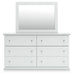 Details | B139B42: Includes panel headboard/footboard and rails, Made with engineered wood (MDF/particleboard/plywood) and decorative laminate for the right balance of affordability and durability, Replicated solid white paint, Decorative laminate replicates natural or man-made material surfaces with consistent color, pattern and texture, Foundation/box spring required, sold separately, Mattress available, sold separately, Assembly required, B139B40: Includes dresser and mirror, Made of engineered wood (MDF/particleboard), Knobs with pewter-tone finish, Scalloped moulding, 6 smooth-operating drawers, Includes tipover restraint device, Mirror attaches to back of dresser; can also be mounted on wall horizontally or vertically, Safety is a top priority, clothing storage units are designed to meet the most current standard for stability, ASTM F 2057 (ASTM International), Drawers extend out to accommodate maximum access to drawer interior while maintaining safety, B139-46: Made of engineered wood (MDF/particleboard), Pewter-tone knobs, Scalloped moulding, 5 smooth-operating drawers, Small Space Solution, Includes tipover restraint device, Safety is a top priority, clothing storage units are designed to meet the most current standard for stability, ASTM F 2057 (ASTM International), Drawers extend out to accommodate maximum access to drawer interior while maintaining safety, B139-91: Made of engineered wood (MDF/particleboard), Pewter-tone knobs, 1 smooth-operating drawer, 1 storage cubby, Scalloped moulding, Small Space Solution, | |