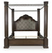 Details B947B10: Includes upholstered poster headboard panel, poster footboard panel, rails, slats, posts and canopy , Made with hardwood solids, oak veneer, MDF substrates and cast resin components, Dark brown finish, Metal canopy, Foam headboard cushion with polyester upholstery, Measure room, including ceiling height, to ensure bed clears fans and light fixtures, Foundation/box spring required, sold separately, Mattress available, sold separately, Assembly required, B947B1: Includes dresser and mirror, Made with hardwood solids, oak and ash swirl veneers, MDF substrates and cast resin components, Dark brown finish, 6 smooth-gliding drawers with dovetail construction (top drawer felt lined), Drawer pulls with antiqued goldtone finish, Mirror attaches to back of dresser,