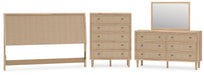 Clean-lined and contemporary—but far from stark—this bedroom package is a fresh style awakening. Pairing a light finish with replicated oak grain and textured beige details that replicate the look of cane, its mixed materials bring a naturally versatile vibe to your bedroom. Sleek, simple hardware plays perfectly with the modern aesthetic.