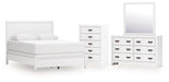 Details | B427B6: Includes queen panel headboard, footboard, rails and slats, Made with hardwood solids, okoume veneer and MDF substrates, White finish, Foundation/box spring required, sold separately, Mattress available, sold separately, Assembly required, B427B1: Includes dresser and mirror, Made with hardwood solids, okoume veneer and MDF substrates, White finish, 6 drawers with dovetail construction and metal center guides, Hardware with dark finish, Drawer interiors are lined with a wood grain laminate for a clean, finished look, Mirror attaches to back of dresser, B427-46: Made with hardwood solids, okoume veneer and MDF substrates, White finish, 5 drawers with dovetail construction and metal center guides, Hardware with dark finish, Drawer interiors are lined with a wood grain laminate for a clean, finished look, | |