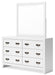 Details | B427B6: Includes queen panel headboard, footboard, rails and slats, Made with hardwood solids, okoume veneer and MDF substrates, White finish, Foundation/box spring required, sold separately, Mattress available, sold separately, Assembly required, B427B1: Includes dresser and mirror, Made with hardwood solids, okoume veneer and MDF substrates, White finish, 6 drawers with dovetail construction and metal center guides, Hardware with dark finish, Drawer interiors are lined with a wood grain laminate for a clean, finished look, Mirror attaches to back of dresser, B427-92: Made with hardwood solids, okoume veneer and MDF substrates, White finish, 2 drawers with dovetail construction and metal center guides, Hardware with dark finish, Drawer interiors are lined with a clean wood grain laminate for a clean, finished look, | |