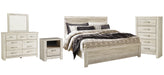 Details B331B2: Includes headboard, footboard and rails, Made of engineered wood (MDF/particleboard) and decorative laminate, Wispy white finish over replicated oak grain with authentic touch, Foundation/box spring required, sold separately, Mattress available, sold separately, Assembly required, Bed is compatible with an adjustable base, B331B1: Includes dresser and mirror, Made of engineered wood (MDF/particleboard) and decorative laminate, Wispy white finish over replicated oak grain with authentic touch, Brushed nickel-tone hardware with black edging, 7 smooth-gliding drawers (lined with faux linen laminate), Mirror attaches to back of dresser, Safety is a top priority, clothing storage units are designed to meet the most current standard for stability, ASTM F 2057 (ASTM International), Drawers extend out to accommodate maximum access to drawer interior while maintaining safety, Assembly required, B331-46: Made of engineered wood (MDF/particleboard) and decorative laminate, Wispy white finish over replicated oak grain with authentic touch, Brushed nickel-tone hardware with black edging, 5 smooth-gliding drawers (lined with faux linen laminate), Safety is a top priority, clothing storage units are designed to meet the most current standard for stability, ASTM F 2057 (ASTM International), Drawers extend out to accommodate maximum access to drawer interior while maintaining safety, Assembly required, B331-91: Made of engineered wood (MDF/particleboard) and decorative laminate, Wispy white finish over replicated oak grain with authentic touch, 1 storage cubby, 1 smooth-gliding drawer (lined with faux linen laminate), Brushed nickel-tone hardware with black edging, Slim-profile USB charging station, Power cord included; UL Listed, Assembly required,