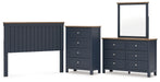 Details B414-57: Made with hardwood solids, mindi wood veneer and MDF substrates, Two-tone finish features a dark slate blue with a light brown wood-tone top, ¼" bolts (not included) are needed to attach headboard to your existing bed frame, Assembly required, B414B1: Includes dresser and mirror, Made with hardwood solids, mindi wood veneer and MDF substrates, Two-tone finish features a dark slate blue with light brown wood-tone top, Nickel-tone metal knobs, 6 drawers with fully finished interior, dovetail construction and heavy duty ball-bearing side glides, Mirror attaches to back of dresser, B414-45: Made with hardwood solids, mindi wood veneer and MDF substrates, Two-tone finish features a dark slate blue with a light brown wood-tone top, Nickel-tone metal knobs, 4 drawers with fully finished interior, dovetail construction and heavy duty ball-bearing side glides,