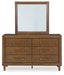 Details | B615B2: Includes upholstered panel headboard and footboard , Solid wood frame, Due to the use of natural wood materials, some variations may occur , Frame with medium brown wood tone finish, Polyester upholstery, Tapered legs, Foundation/box spring required, sold separately , Mattress available, sold separately, Assembly required, B615B1: Includes dresser and mirror, Made with hardwood solids, mango wood veneer and MDF substrates, Medium brown wood-tone finish, 6 drawers with fully finished interior, dovetail construction and heavy duty ball-bearing side glides, Round tapered legs, Mirror attaches to back of dresser, B615-46: Made with hardwood solids, mango wood veneer and MDF substrates, Medium brown wood-tone finish, 5 drawers with fully finished interior, dovetail construction and heavy duty ball-bearing side glides, Round tapered legs, B615-92: Made with hardwood solids, mango wood veneer and MDF substrates, Medium brown wood-tone finish, 2 drawers with fully finished interior, dovetail construction and heavy duty ball-bearing side glides, Round tapered legs, 110V power supply with USB-A and USB-C charging ports, Power cord included; UL Listed, | |
