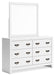 Details | B427B2: Includes twin panel headboard, footboard, rails and slats, Made with hardwood solids, okoume veneer and MDF substrates, White finish, Foundation/box spring required, sold separately, Mattress available, sold separately, Assembly required, B427B1: Includes dresser and mirror, Made with hardwood solids, okoume veneer and MDF substrates, White finish, 6 drawers with dovetail construction and metal center guides, Hardware with dark finish, Drawer interiors are lined with a wood grain laminate for a clean, finished look, Mirror attaches to back of dresser, B427-46: Made with hardwood solids, okoume veneer and MDF substrates, White finish, 5 drawers with dovetail construction and metal center guides, Hardware with dark finish, Drawer interiors are lined with a wood grain laminate for a clean, finished look, B427-92: Made with hardwood solids, okoume veneer and MDF substrates, White finish, 2 drawers with dovetail construction and metal center guides, Hardware with dark finish, Drawer interiors are lined with a clean wood grain laminate for a clean, finished look, | |