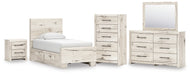 Details | B2310B23: Includes panel headboard, panel footboard, 2 under bed storage units and roll slats , Made with engineered wood (MDF/particleboard/plywood) and decorative laminate for the right balance of affordability and durability, Rustic white finish over replicated reclaimed oak grain with authentic touch, Decorative laminate replicates natural or man-made material surfaces with consistent color, pattern and texture, 4 smooth-gliding storage drawers, Drawer interiors are lined with a faux linen laminate for a clean, finished look, Handles with dark pewter-tone finish, Bed does not require additional foundation/box spring; accommodates most zero clearance adjustable bases with the addition of a bunkie board , Mattress available, sold separately, Minor assembly required, B2310B1: Made with engineered wood (MDF/particleboard/plywood) and decorative laminate for the right balance of affordability and durability, Rustic white finish over replicated reclaimed oak grain with authentic touch, Decorative laminate replicates natural or man-made material surfaces with consistent color, pattern and texture, Handles with dark pewter-tone finish, 6 smooth-gliding drawers, Drawer interiors are lined with a faux linen laminate for a clean, finished look, Framed front and pilasters, Safety is a top priority, clothing storage units are designed to meet the most current standard for stability, ASTM F 2057 (ASTM International), Drawers extend out to accommodate maximum access to drawer interior while maintaining safety, Mirror attaches to back of dresser; can also be mounted on wall horizontally or vertically , Minor assembly required, B2310-46: Made with engineered wood (MDF/particleboard/plywood) and decorative laminate for the right balance of affordability and durability, Rustic white finish over replicated reclaimed oak grain with authentic touch, Decorative laminate replicates natural or man-made material surfaces with consistent color, pattern and texture, Handles with dark pewter-tone finish, 5 smooth-gliding drawers, Drawer interiors are lined with a faux linen laminate for a clean, finished look, Framed front and pilasters, Safety is a top priority, clothing storage units are designed to meet the most current standard for stability, ASTM F 2057 (ASTM International), Drawers extend out to accommodate maximum access to drawer interior while maintaining safety, Minor assembly required, B2310-92: Made with engineered wood (MDF/particleboard/plywood) and decorative laminate for the right balance of affordability and durability, Rustic white finish over replicated reclaimed oak grain with authentic touch, Decorative laminate replicates natural or man-made material surfaces with consistent color, pattern and texture, Handles with dark pewter-tone finish, 2 smooth-gliding drawers, Drawer interiors are lined with a faux linen laminate for a clean, finished look, Framed front and pilasters, 2 slim-profile USB charging ports, Power cord included; UL Listed, Minor assembly required, | |