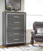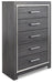 Details | Made of engineered wood (MDF/particleboard) and decorative laminate, Gray finish with replicated wood grain, Faceted chrome-tone pulls and accents, 5 smooth-operating drawers, Drawer interiors are lined with a faux linen laminate for a clean, finished look, Safety is a top priority, clothing storage units are designed to meet the most current standard for stability, ASTM F 2057 (ASTM International), Drawers extend out to accommodate maximum access to drawer interior while maintaining safety | |