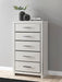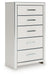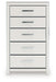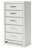 Details Made with engineered wood (MDF/particleboard/plywood) and decorative laminate for the right balance of affordability and durability, Matte white finish with subtle replicated wood grain, Decorative laminate replicates natural or man-made material surfaces with consistent color, pattern and texture, Chrome-tone accents, Large-scale chrome-tone handles with faceted details, 5 smooth-gliding drawers, Drawer interiors are lined with a faux linen laminate for a clean, finished look, Safety is a top priority, clothing storage units are designed to meet the most current standard for stability, ASTM F 2057 (ASTM International), Drawers extend out to accommodate maximum access to drawer interior while maintaining safety, Minor assembly required