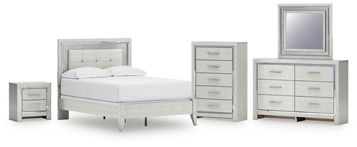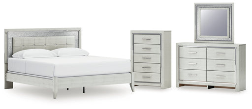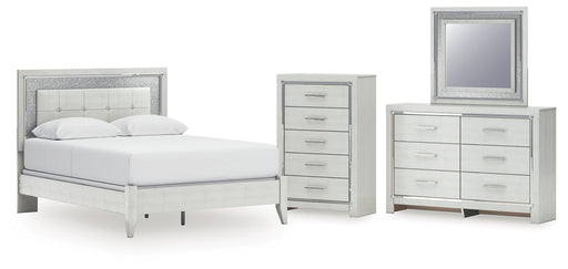 Zyniden King Upholstered Panel Bed with Mirrored Dresser, Chest and Nightstand