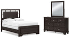 Details | B441B4: Includes panel headboard, footboard, rails and slats, Made with hardwood solids, engineered wood veneer and MDF substrates, Dark brown finish, Floating panel headboard, Picture frame footboard, Foundation/box spring required, sold separately , Mattress available, sold separately, Assembly required, B441B1: Includes dresser and mirror, Made with hardwood solids, engineered wood veneer and MDF substrates, Dark brown finish, Metal bar pulls with bright nickel-tone finish, 7 smooth-gliding drawers with dovetail construction and metal center guides, Drawer interiors are lined with a wood grain laminate for a clean, finished look, Top moulding on dresser, Mirror attaches to back of dresser, | |