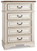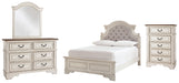 Details B743-45: Made of veneers, wood and engineered wood, with cast resin components, Antiqued two-tone finish, 5 smooth-gliding drawers with dovetail construction (top drawer felt lined), Dark bronze-tone hardware, B743B12: Made of veneers, wood and engineered wood, with cast resin components, Antiqued two-tone finish, 6 smooth-gliding drawers with dovetail construction, Dark bronze-tone hardware, Mirror attaches to back of dresser, Assembly required, Includes tipover restraint device, B743B14: Made of veneers, wood and engineered wood, with cast resin components, Includes upholstered headboard, footboard and rails, Distressed, chipped white finish, Upholstered headboard with foam cushion, button tufting, Assembly required, Mattress and foundation/box spring available, sold separately, Bed is compatible with an adjustable base,