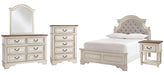 Details B743B12: Made of veneers, wood and engineered wood, with cast resin components, Antiqued two-tone finish, 6 smooth-gliding drawers with dovetail construction, Dark bronze-tone hardware, Mirror attaches to back of dresser, Assembly required, Includes tipover restraint device, B743B14: Made of veneers, wood and engineered wood, with cast resin components, Includes upholstered headboard, footboard and rails, Distressed, chipped white finish, Upholstered headboard with foam cushion, button tufting, Assembly required, Mattress and foundation/box spring available, sold separately, Bed is compatible with an adjustable base, B743-91: Made of veneers, wood and engineered wood, with cast resin components, Antiqued two-tone finish, Smooth-gliding drawer with dovetail construction, Dark bronze-tone finished metal hardware, Open display shelf, Assembly required, B743-45: Made of veneers, wood and engineered wood, with cast resin components, Antiqued two-tone finish, 5 smooth-gliding drawers with dovetail construction (top drawer felt lined), Dark bronze-tone hardware,