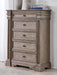 Details B916B4: Includes panel headboard, footboard with slats and rails, Made with hardwood solids, oak and ash veneer, cast resin components and engineered wood substrates, Tops with inlaid ash veneer border, Light warm grayish brown glazed wood finish, Breakfront pilasters, Inset picture frame panels, Headboard features light bridge with 2 overhead LED lights, Foundation/box spring required, sold separately , Mattress available, sold separately, Assembly required, B916B1: Includes dresser and mirror, Made with hardwood solids, oak and ash veneer, cast resin components and engineered wood substrates, Tops with inlaid ash veneer border, Light warm grayish brown glazed wood finish, Round metal knobs with satin nickel-tone finish, 10 drawers with fully finished interior, dovetail construction and ball-bearing side glides, Drawers with inset framed fronts, Dresser with breakfront pilasters, Mirror frame features light bridge with 2 mini LED lights, Mirror attaches to back of dresser, B916-46: Made with hardwood solids, oak and ash veneer, cast resin components and engineered wood substrates, Top with inlaid ash veneer border, Light warm grayish brown glazed wood finish, Round metal knobs with satin nickel-tone finish, 5 drawers with fully finished interior, dovetail construction and ball-bearing side glides, Drawers with inset framed fronts, Breakfront pilasters, B916-93: Made with hardwood solids, oak and ash veneer, cast resin components and engineered wood substrates, Top with inlaid ash veneer border, Light warm grayish brown glazed wood finish, Round metal knobs with satin nickel-tone finish, 3 drawers with fully finished interior, dovetail construction and ball-bearing side glides, Drawers with inset framed fronts, Breakfront pilasters, 110V power supply with dual USB charging ports, Power cord included; UL Listed,