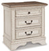 Details | B743-46: Made of veneers, wood and engineered wood, with cast resin components, Antiqued two-tone finish, Dark bronze-tone finished metal hardware, 5 smooth-gliding drawers with dovetail construction, Includes tipover restraint device, Small Space Solution, Includes tipover restraint device, B743-93: Made of veneers, wood and engineered wood, with cast resin components, Antiqued two-tone finish, 3 smooth-gliding drawers with dovetail construction, Dark bronze-tone finished metal hardware, 2 electrical outlets and USB charging ports, Power cord included; UL Listed, Small Space Solution, B743B1: Made of veneers, wood and engineered wood, with cast resin components, Antiqued two-tone finish, 7 smooth-gliding drawers with dovetail construction, Dark bronze-tone hardware, Mirror attaches to back of dresser, Assembly required, Includes tipover restraint device, B743B11: Made of wood and engineered wood, with cast resin components, Includes headboard, footboard and rails, Distressed, chipped white finish, Polyester upholstery with foam cushion and button tufting, Foundation/box spring required, sold separately, Mattress available, sold separately, Assembly required, Bed is compatible with an adjustable base, | |
