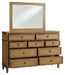 Details B895B6: Includes upholstered panel headboard, footboard, rails and slats, Made with hardwood solids, hickory veneer and MDF substrates, Light brown wood-tone finish, Polyester upholstery, Foundation/box spring required, sold separately, Mattress available, sold separately, Assembly required, B895B1: Includes dresser and mirror, Made with hardwood solids, hickory wood veneer and MDF substrates, Light brown wood-tone finish, Dark bronze-tone drawer pulls, 9 drawers with fully finished interior, dovetail construction and heavy duty ball-bearing side glides (top drawers felt lined), Mirror attaches to back of dresser, B895-93: Made with hardwood solids, hickory wood veneer and MDF substrates, Light brown wood-tone finish, Dark bronze-tone drawer pulls, 3 drawers with fully finished interior, dovetail construction and heavy duty ball-bearing side glides (top drawer felt lined), 110V power supply with USB-A and USB-C charging ports, Power cord included; UL Listed,