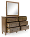 Details | B787B2: Includes upholstered headboard, panel rails and bench footboard with slats, Made with hardwood solids, veneers and MDF substrates, Brown finish, Polyester upholstery, Nailhead trim, Turned feet, Foundation/box spring required, sold separately , Mattress available, sold separately, Assembly required, B787B1: Includes dresser and mirror, Made with hardwood solids, veneers and MDF substrates, Brown finish, Oil-rubbed bronze-tone knobs, 6 drawers with fully finished interior, dovetail construction and heavy duty ball-bearing side glides (top drawers felt lined), Turned feet, Mirror attaches to back of dresser, | |