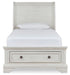 Details | Includes headboard, storage footboard and rails with roll slats, Made with select oak veneer, engineered wood, solid wood components and cast resin components, Antiqued white finish with grain texture, 2 smooth-gliding drawers with dovetail construction and metal ball bearing side glides, Dark bronze-tone knobs, Bed does not require additional foundation/box spring; accommodates most zero clearance adjustable bases with the addition of a bunkie board, Mattress available, sold separately , Assembly required | |