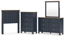Details B414-53: Made with hardwood solids, mindi wood veneer and MDF substrates, Two-tone finish features a dark slate blue with a light brown wood-tone top, ¼" bolts (not included) are needed to attach headboard to your existing bed frame, Assembly required, B414B1: Includes dresser and mirror, Made with hardwood solids, mindi wood veneer and MDF substrates, Two-tone finish features a dark slate blue with light brown wood-tone top, Nickel-tone metal knobs, 6 drawers with fully finished interior, dovetail construction and heavy duty ball-bearing side glides, Mirror attaches to back of dresser, B414-45: Made with hardwood solids, mindi wood veneer and MDF substrates, Two-tone finish features a dark slate blue with a light brown wood-tone top, Nickel-tone metal knobs, 4 drawers with fully finished interior, dovetail construction and heavy duty ball-bearing side glides,
