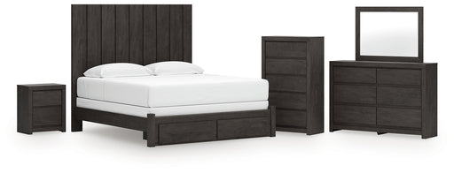 King Panel Storage Bed with Mirrored Dresser and Chest