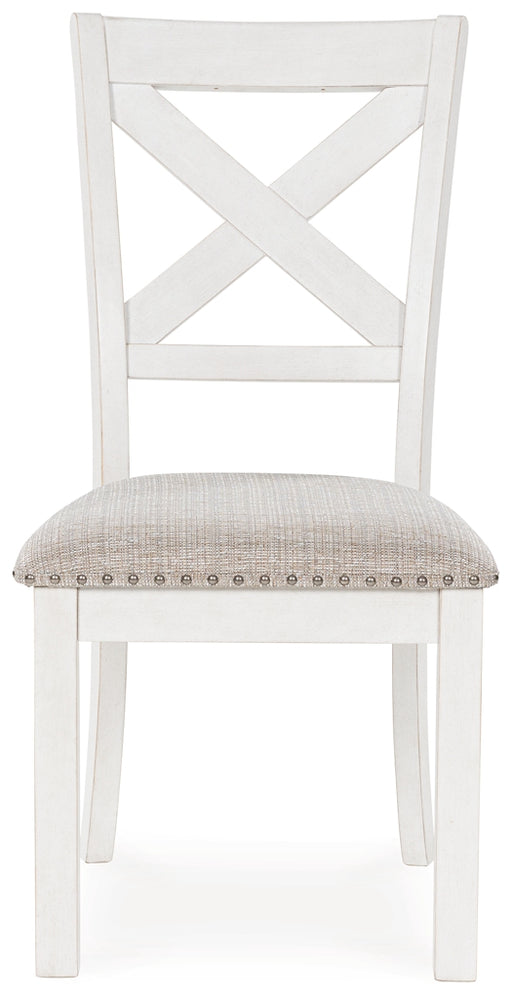 This dining chair is sure to impress come mealtime. With its antiqued white finish, classic country X-back and light gray upholstery with nailhead ...