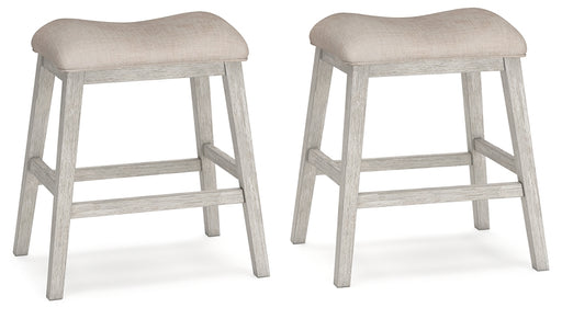 This counter height bar stool is sure to impress come mealtime. With a white finish and light gray upholstery, modern farmhouse-style seating has n...