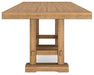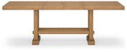 Details D773-32: Made with rubberwood solids, distressed pine veneers and MDF substrates, Distressed light brown pine finish, Double trestle base, Seats up to 10, 2 removable center leaves, Table extends by pulling both ends and dropping in leaf, Solid wood stretcher, Assembly required, D773-124: Made with wood, Distressed light brown pine finish, Foam cushion with textured polyester upholstery, Assembly required,