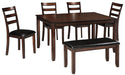 Details Includes table, 4 upholstered chairs and upholstered bench, Table made of veneers, wood and engineered wood, Wood frame chairs and bench, Cushioned seats with faux leather upholstery, Seats 6, Assembly required, Expert assembly recommended; available at check out for an additional fee