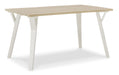 Bring light to your dining area with the clean lines and bright two-tone finish of this dining package. The rectangular dining table, with stylized saber legs in a white finish, matches the spindle-back chairs for beautiful simplicity. The table’s melamine top, in a light tan color, provides additional durability, marrying minimalism with big style for a delightful combination.