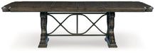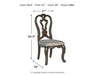 Details | D947D5: Made with hardwood solids, oak and ash swirl veneers, MDF substrates and cast resin components, Dark brown finish, Double pedestal base, Removable center leaf, Table extends by pulling both ends and dropping in leaf, Shaped metal stretcher bar, Dining chairs sold separately, Seats up to 8, Assembly required, D947-01: Made with wood and cast resin, Dark brown finish, Foam cushioned seat with polyester upholstery, Ornate cabriole legs, Assembly required, | |