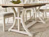 Details D683-35: Made with hardwood solids, select veneers and MDF substrates, Two-tone finish (antiqued white and light grayish brown wood tone), Double trestle base, Removable center leaf stores conveniently underneath the tabletop, Table extends by pulling both ends and dropping in leaf, Seats up to 8, Assembly required, D683-02: Made with solid wood frame, Antiqued white finish, Polyester upholstery, Next-Gen Nuvella™ is a performance fabric that is soft, easy to clean, stain-resistant and durable, Clean fabric with mild soap and water, let air dry; for stubborn stains, use a solution of 4 oz. bleach to 28 oz. water Foam cushioned seat, Legs with adjustable levelers, Assembly required,