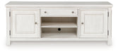 Details Made with hardwood solids, ash veneer and MDF substrates, Antiqued white finish with wood grain texture, Round metal knobs with aged pewter-tone finish, 2 cabinets, each with adjustable shelf, Open cabinet with adjustable shelf, Smooth-gliding drawer with fully finished interior, dovetail construction and heavy-duty ball-bearing side glides, Cutouts for cord management, Assembly required