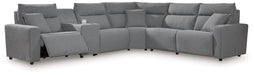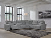 Details | Includes 6 modular pieces: left-arm facing power recliner, 2 armless chairs, console, wedge and right-arm facing power recliner, "Left-arm" and "right-arm" describe the position of the arm when you face the piece, Versatile modular pieces fit together in a variety of configurations, One-touch power control with adjustable positions, Easy View™ adjustable headrest and zero-draw USB port, Zero-draw technology only consumes power when the USB receptacle is in use, Corner-blocked frame with metal reinforced seat, Attached back and seat cushions; high-quality foam cushions wrapped in poly fiber, Polyester upholstery; Next-Gen Nuvella™ is a family-friendly fabric that is soft, easy to clean, stain-resistant and durable, Clean fabric with mild soap and water, let air dry; for stubborn stains, use a solution of 4 oz. bleach to 28 oz. water, Throw pillows with easy-to-remove zippered covers for machine washing; pillows with soft polyfill, Console with plexiglass top and 2 cup holders, Zero wall recliner design requires minimal space between wall and chair back, Power cord included; UL Listed | |