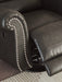 Everyone can have the best seat in the house with this swivel glider recliner. Its nailhead trim puts the finishing touches on the traditional roll arms you love. The recliner's comfy, durable cushions—wrapped in a rustic yet sophisticated faux leather—keep you feeling relaxed, while its turned legs show that style and quality flow from top to bottom. Plus the smooth reclining motion and 360-degree swivel keep you in the flow of conversation.