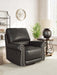 Details Pull tab reclining motion, Corner-blocked frame with metal reinforced seat, Attached cushions, High-resiliency foam cushions wrapped in poly fiber, Faux leather upholstery, Decorative turned legs with faux wood finish, 360-degree swivel, Gentle rocking motion