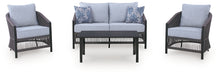 Details | Includes loveseat, 2 lounge chairs and coffee table, Rust-resistant aluminum frame with durable powder coated finish, Powder coated aluminum resists rusting and fading, Polyester rope, Foam cushion core wrapped in soft polyester for a low-maintenance, comfortable cushion, Solution-dyed high-performance fabric, Nuvella® is an outdoor fabric that can be cleaned and offers enhanced UV resistance, Clean fabric with mild soap and water, let air dry; for stubborn stains, use a solution of 4 oz. bleach to 28 oz. water, Stainless steel hardware resists rust and boosts longevity, Designed to withstand the harsh elements of the outdoors, 2 throw pillows included, Assembly required | |