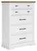 Details B844B5: Includes panel headboard, storage footboard, rails and roll slats, Footboard made with hardwood solids, MDF substrates and butcher block oak veneer, Headboard and rails made with hardwood solids and MDF substrates, White finish, Headboard with inset black metal barn sash, 2 drawers in footboard with fully finished interior, dovetail construction and ball-bearing side glides, Pulls with matte black finish, Bed does not require a foundation/box spring, Mattress available, sold separately, Assembly required, B844B1: Includes dresser and mirror, Made with hardwood solids, MDF substrates and butcher block oak veneer, Dresser with 2-tone finish (white finish; butcher block oak veneer with natural finish), Pulls with matte black finish, 10 spacious drawers with fully finished interiors (top drawers felt lined), dovetail construction and ball-bearing side glides , Drawers with inset picture fronts, Mirror attaches to back of dresser, B844-46: Made with hardwood solids, MDF substrates and butcher block oak veneer, 2-tone finish (white finish; butcher block oak veneer with natural finish), Pulls with matte black finish, 5 spacious drawers with fully finished interiors (top drawers felt lined), dovetail construction and ball-bearing side glides, Drawers with inset picture frame fronts, B844-93: Made with hardwood solids, MDF substrates and butcher block oak veneer, 2-tone finish (white finish; butcher block oak veneer with natural finish), Pulls with matte black finish, 3 spacious drawers with fully finished interiors (top drawers felt lined), dovetail construction and ball-bearing side glides, 110V power supply with dual USB charging ports, Power cord included; UL Listed, Drawers with inset picture frame fronts,