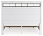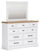 Details | B844B4: Includes panel headboard, storage footboard, rails and roll slats, Footboard made with hardwood solids, MDF substrates and butcher block oak veneer, Headboard and rails made with hardwood solids and MDF substrates, White finish, Headboard with inset black metal barn sash, 2 drawers in footboard with fully finished interior, dovetail construction and ball-bearing side glides, Pulls with matte black finish, Bed does not require a foundation/box spring, Mattress available, sold separately, Assembly required, B844B1: Includes dresser and mirror, Made with hardwood solids, MDF substrates and butcher block oak veneer, Dresser with 2-tone finish (white finish; butcher block oak veneer with natural finish), Pulls with matte black finish, 10 spacious drawers with fully finished interiors (top drawers felt lined), dovetail construction and ball-bearing side glides , Drawers with inset picture fronts, Mirror attaches to back of dresser, | |