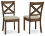 This upholstered dining chair elevates the art of casual rustic style. With a distressed nutmeg finish, antiqued nailhead trim and textured polyester fabric, this upholstered dining chair with classic X back styling entices with warmth and earthy elegance. Cushioned seat accommodates lingering meals enjoyed in comfort.