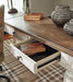 | Details | Includes desk and desk return, Made of wood, engineered wood and veneers, with cast resin components, Antiqued two-tone finish, Return with 2 smooth-gliding drawers with dovetail construction, Desk with spring lift top and drop-front drawer, Return with cutout for cord management, Dark bronze-tone finished metal hardware, 2 AC electrical plug-ins and 2 USB slots, Power cord included; UL-listed, Assembly required | |