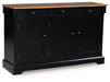 Raise the bar on modern farmhouse style with this dining buffet. Its handsome good looks are accentuated with a two-tone finish and a casual butcher block veneer top. The sturdy silhouette adds a hearty element, whether your style is vintage, country or eclectic. Three drawers and three cabinets with adjustable shelves serve your entertaining needs well.