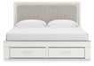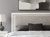 Details Includes upholstered panel headboard, storage footboard, platform rails and roll slats , Made with engineered wood (MDF/particleboard/plywood) and decorative laminate for the right balance of affordability and durability , Matte white finish with subtle replicated wood grain , Decorative laminate replicates natural or man-made material surfaces with consistent color, pattern and texture , Polyester upholstery, Chrome-tone and glitter accents, Large-scale chrome-tone handles with faceted details, 2 smooth-gliding drawers , Drawer interiors are lined with a faux linen laminate for a clean, finished look, Bed does not require additional foundation/box spring; accommodates most zero clearance adjustable bases with the addition of a bunkie board, Mattress available, sold separately, Minor assembly required